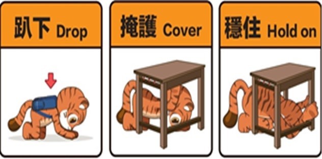 地震發生時首要保護自己,優先執行「趴下、掩護、穩住」抗震保命三步驟。